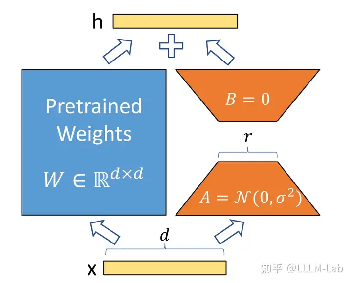 \[h=W_0x+ΔWx=W_0x+BAx\]在开始训练时,对 $A$ 使用随机高斯初始化,对 $B$ 使用零初始化,然后使用 Adam 进行优化。